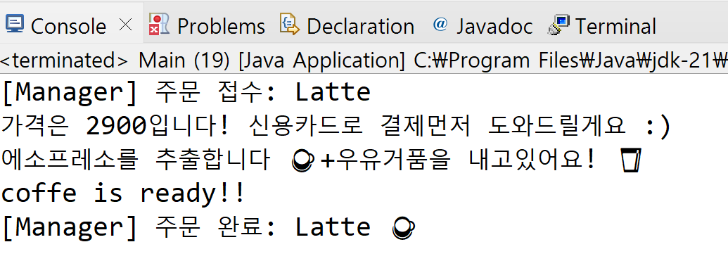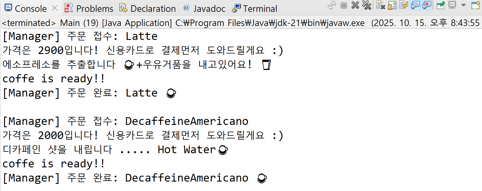 System.out.println("[Manager] 주문 완료: " + coffeeType + " ☕\n");