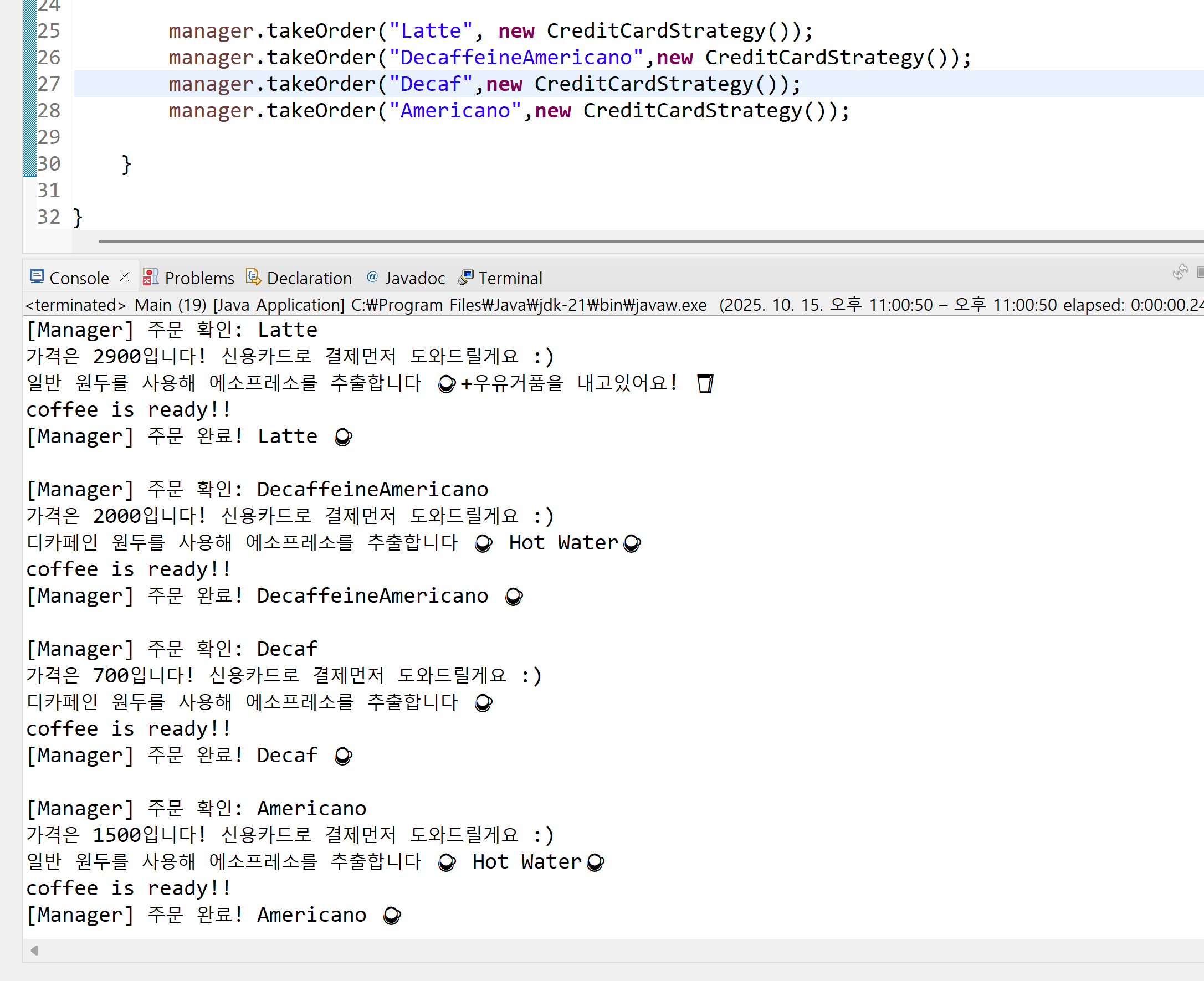 manager.takeOrder("DecaffeineAmericano",new CreditCardStrategy());