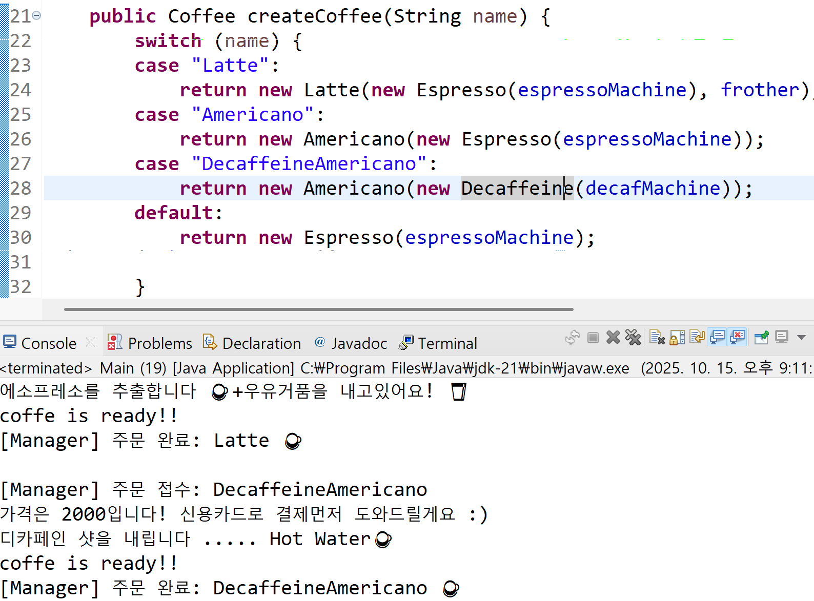 사실 커피메이커 자체에서는 크게 변경할게 없었다. 데코레이터 패턴을 활용해 디카페인 샷을 추가하면서 확장 하였다.