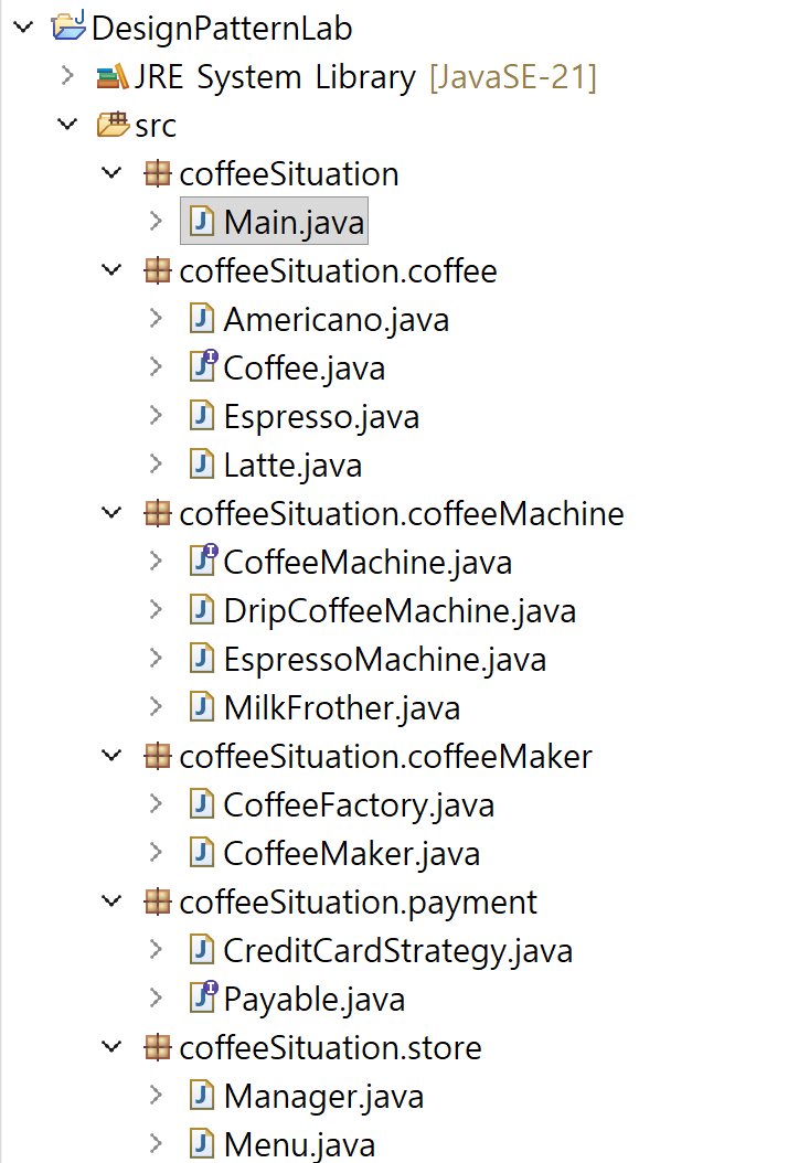 기존에 하나의 패키지에 만들었었던 커피메이커프로젝트를 패키지별로 나눠서 수정을 용이케하는 수정을 거쳤다.