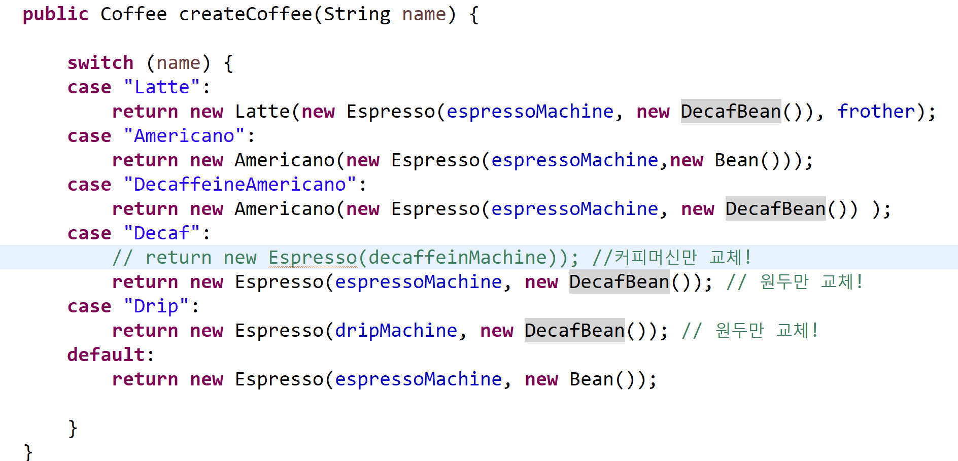 - 나중에 DecafEspresso, DoubleShotEspresso 같은 걸 만들어도 Americano를 재사용할 수 없다. => 수정이 필요하게된다.