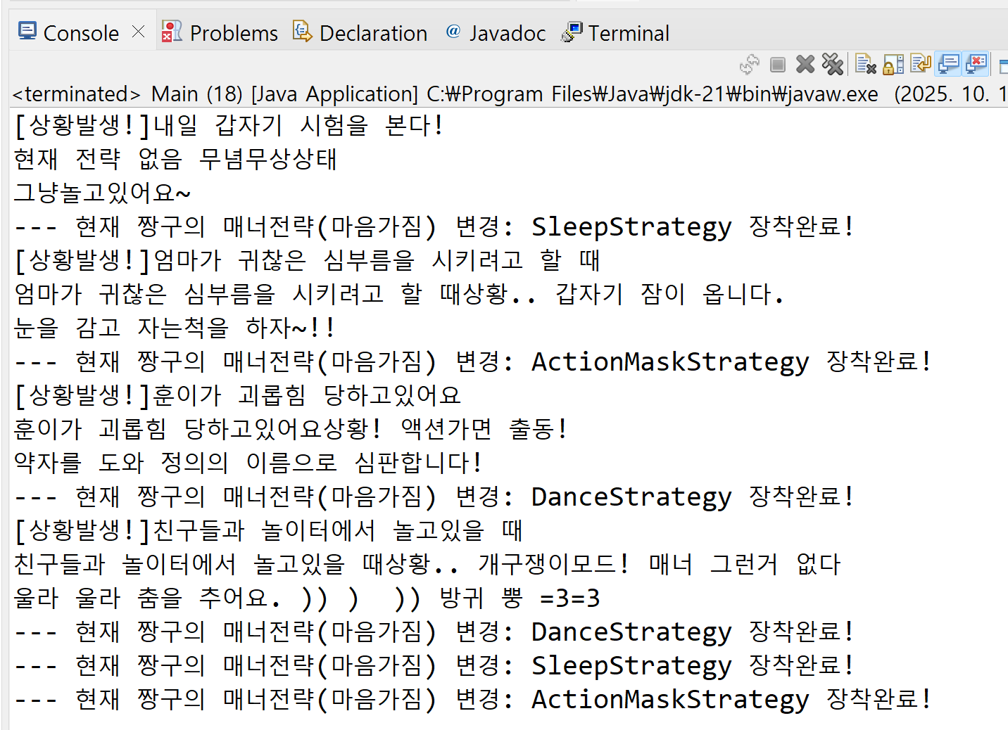 System.out.println(context+ "상황.. 개구쟁이모드! 매너 그런거 없다"); //자는척한다. 회피한다 아는척하면