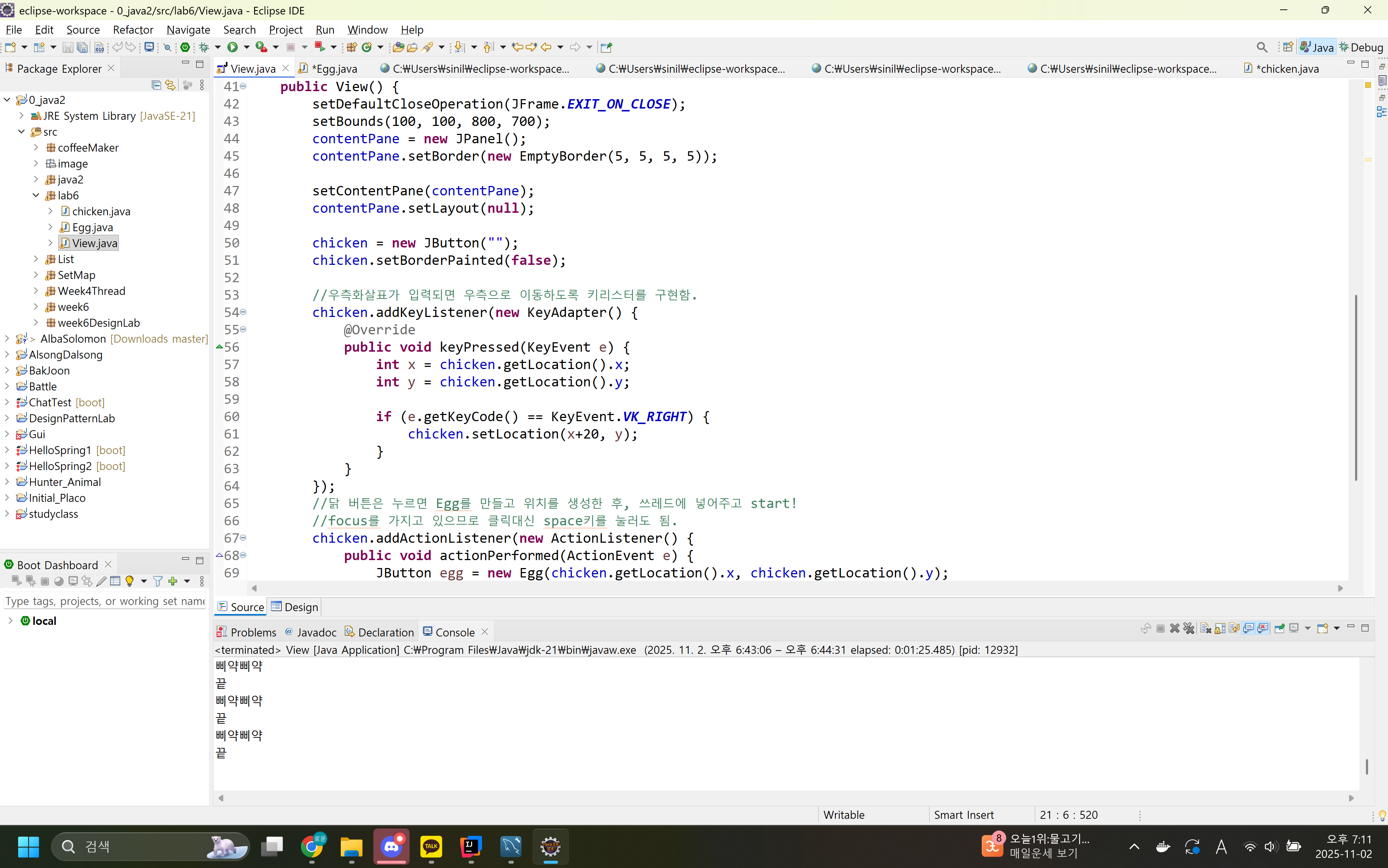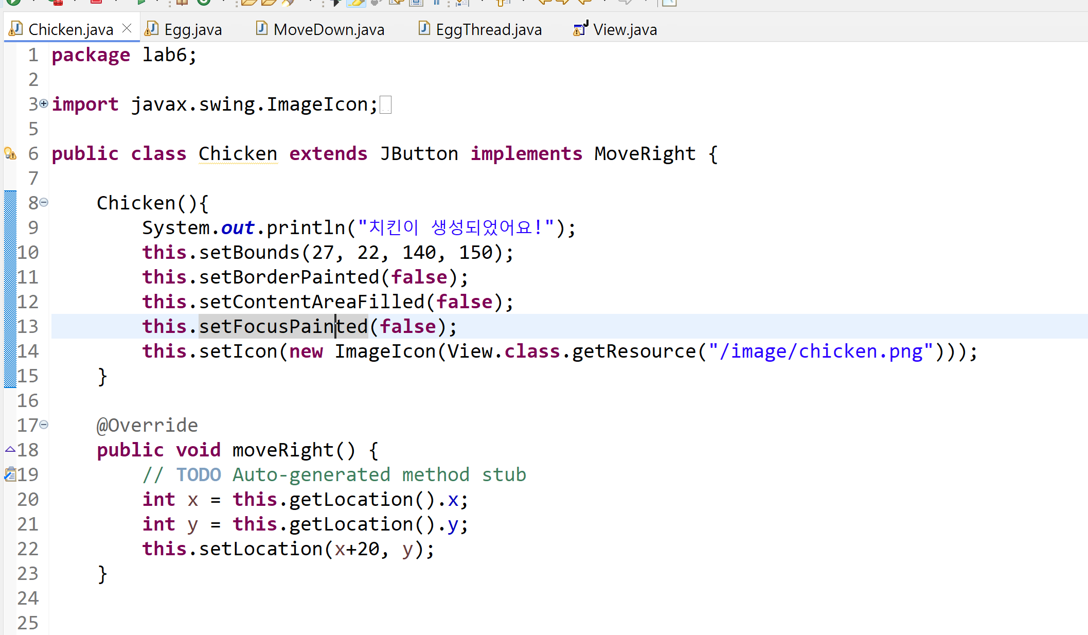 이를 리팩토링해보자. GUI같은경우는 MVC패턴이므로 이를 수정한다. 컨트롤러를 생성하고, 거기에서 닭 생성시키고하면 될것같다. 근데 이걸 하려면 전체적인 프로그램 구조를 변경해야해 시간이 많이 소요될 것 같다..... 이건 아이디어만 생각해보고 나중에해보자.