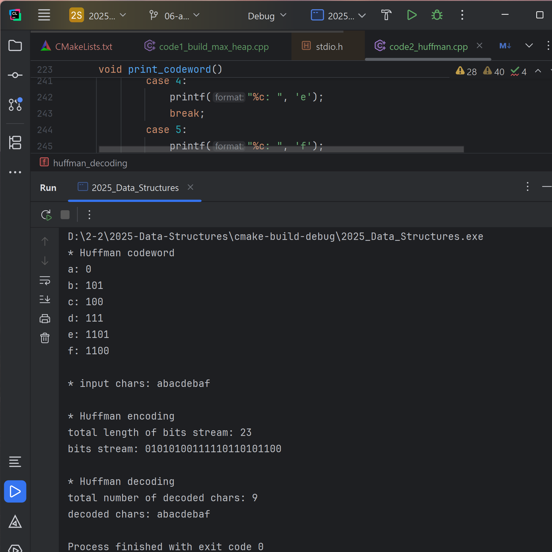 Through this assignment, I realized the advantages of implementing a complete binary tree using an array. By using a structure that contains a pointer to a dynamically allocated array, I could access elements like `heap[1]` or `heap[2]`, which made the heap operations straightforward. This highlighted how structures in C can effectively organize data while providing array-like access, even when using pointers. In the second part of the assignment, I encountered many new terms such as lookup tables, which was challenging at first, but studying them helped reinforce my understanding. It was also fascinating to learn that widely used applications, such as JPEG files, utilize similar Huffman encoding and decoding techniques in real life, connecting theoretical concepts with practical applications.